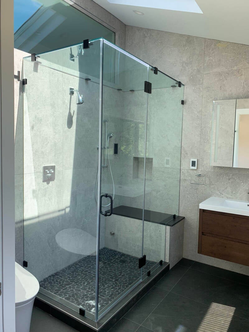 Steam shower enclosures with glass ceiling tops are the perfect solution for those with high ceilings who want to create a luxurious and invigorating bathing experience. Designed specifically for spaces where traditional shower glass cannot reach the ceiling, these custom enclosures offer a seamless and spacious enclosure that combines the benefits of steam therapy with the elegance of glass. The glass ceiling top allows steam to circulate freely, enveloping you in a soothing mist that promotes relaxation and rejuvenation. Our expert team at Modern Glass specializes in crafting steam shower enclosures tailored to your unique space and requirements. Experience the ultimate indulgence in your bathroom with our custom-designed steam shower enclosures, where luxury and functionality meet in perfect harmony. Contact us today to discuss your vision and let us bring your dream steam shower enclosure to life.